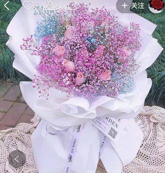 夜上海论坛6朵粉玫瑰蓝色粉色满天星混搭花束,如图制作 |