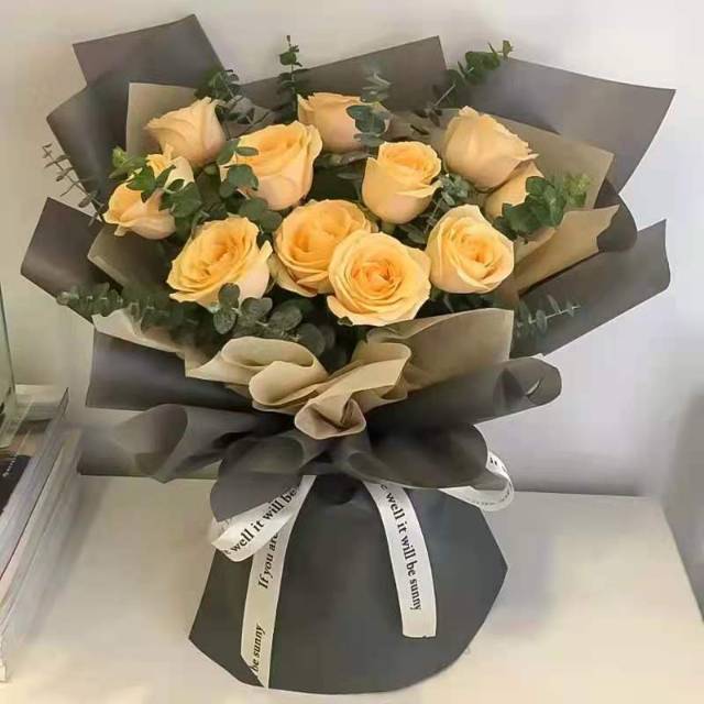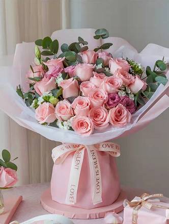 夜上海论坛19朵代安娜粉玫,粉色桔梗3枝,尤加利10枝,石竹梅5枝。如图包 |
