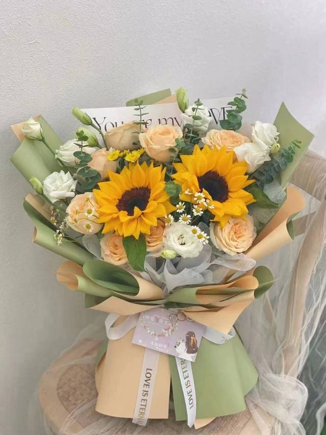 夜上海论坛9支香槟2支向日葵混搭花束,按图包 |