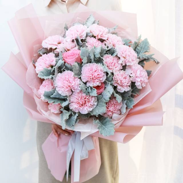 19支粉康乃馨2支粉玫瑰花束,如图 |