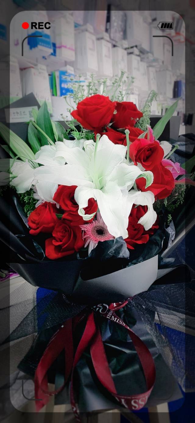 11支红玫瑰加2朵白百合花束.配花加满天星 |