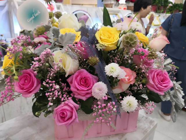 5支向日葵,11支香槟玫瑰,9支康乃馨。其它配色,加些非州菊。如图 |