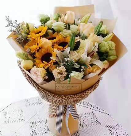 夜上海论坛5支向日葵,3支百合,9支香槟玫瑰,桔梗鲜花束,如图包 |