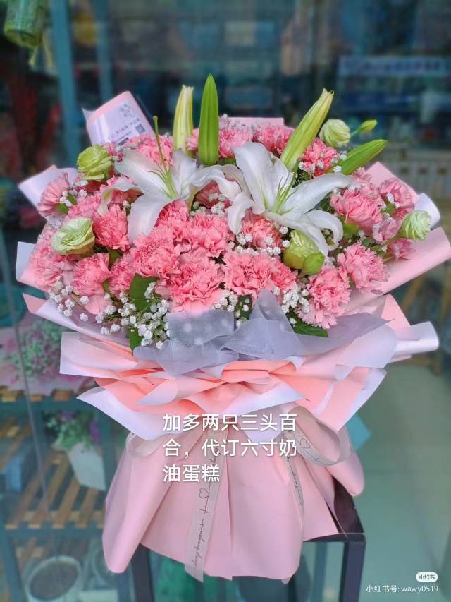 百合加康乃馨如图再加多两只三头百合,再定一下6寸奶油蛋糕。 |