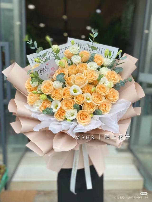 33支香槟玫瑰配白色洋桔梗花束,如图 |