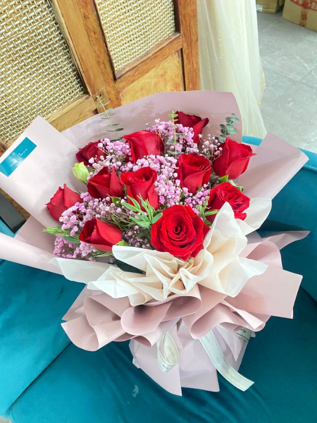 夜上海论坛11朵红玫瑰鲜花束,如图用粉色包装 |