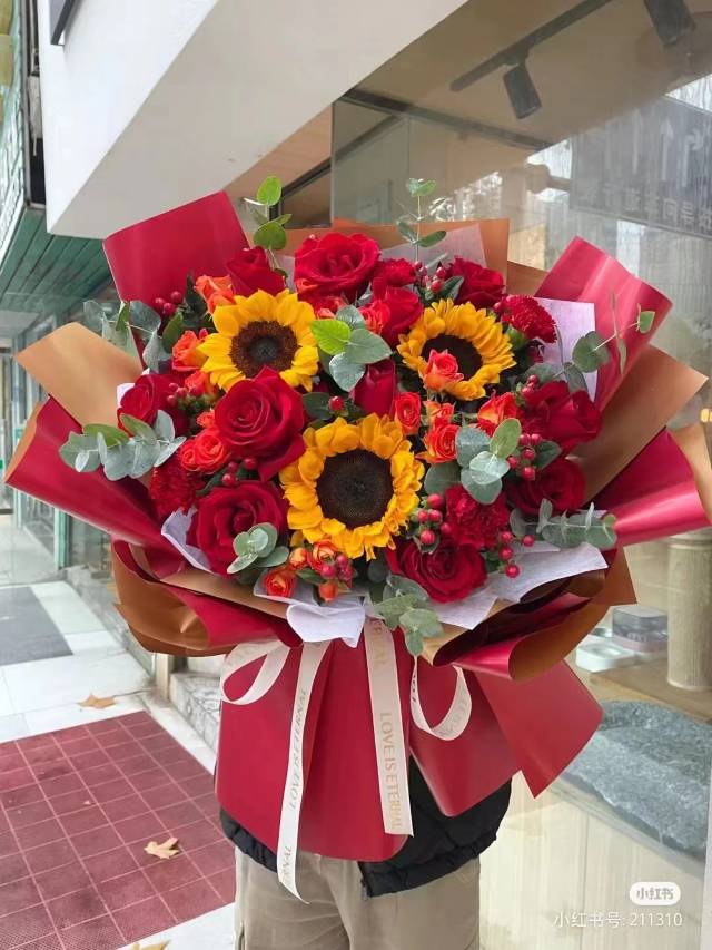 19支红玫瑰3支向日葵混搭花束,按图包 |