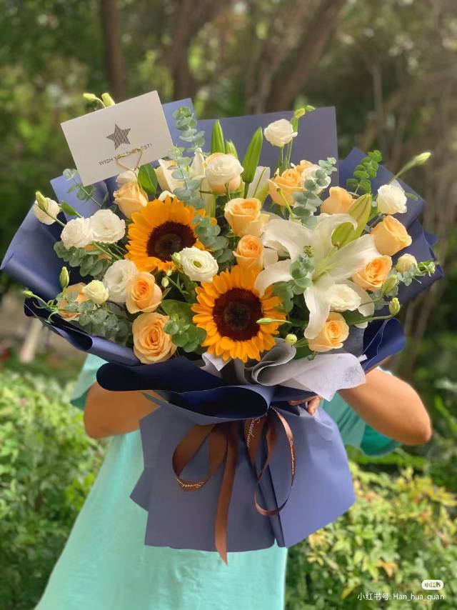 11支香槟2支向日葵2支白百合配白桔梗混搭花束,按图包 |