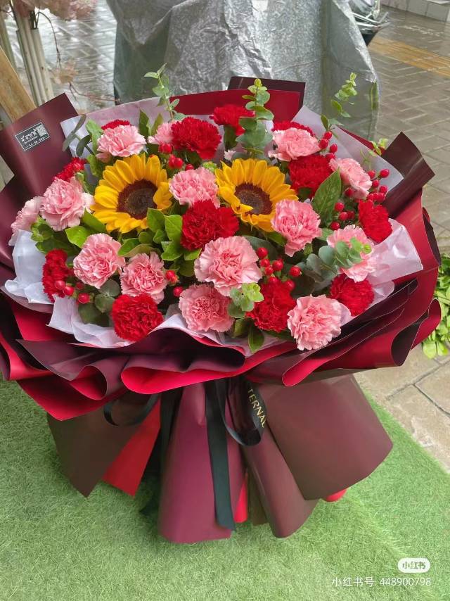 夜上海论坛30朵红 粉康乃馨+2支向日葵混搭花束,如图 |