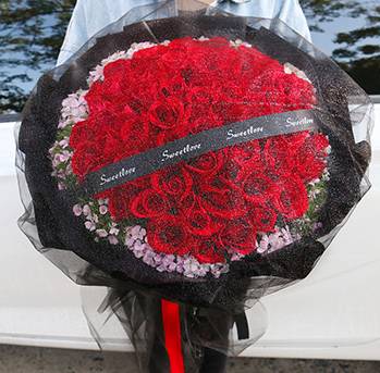 夜上海论坛33颗红樱桃保鲜膜 粉色满天星 黑色牛皮纸包装 咖啡十字礼盒