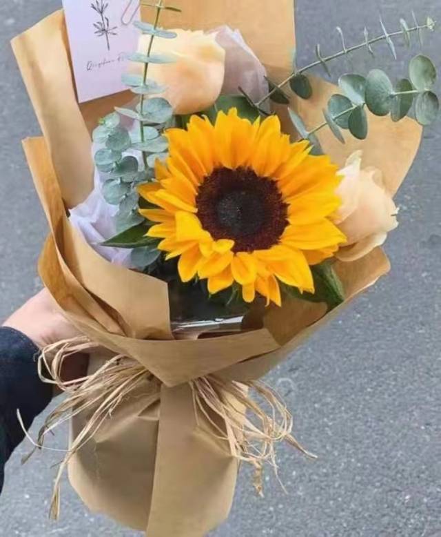1支向日葵2支香槟玫瑰小花束,如图包 |