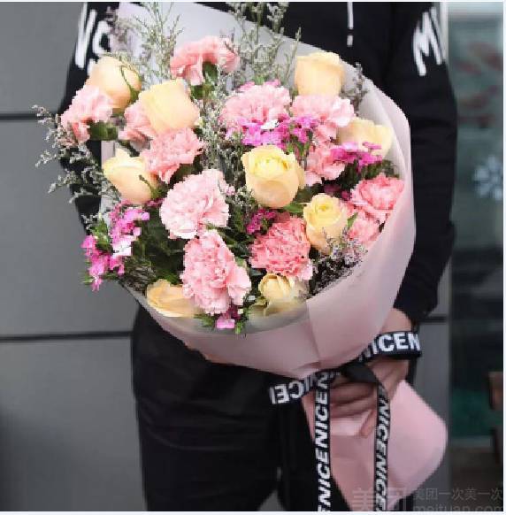 10朵粉康乃馨+9朵香槟玫瑰 花束如图包装 |