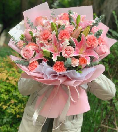 10支粉玫瑰10支粉康乃馨10朵粉百合混搭花束 按图做 |