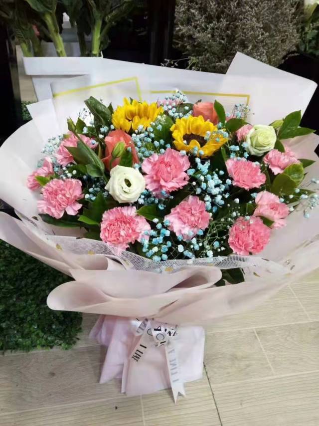 1支粉玫瑰 19支粉康乃馨 2支向日葵蓝色满天星花束(粉玫瑰插中间) |