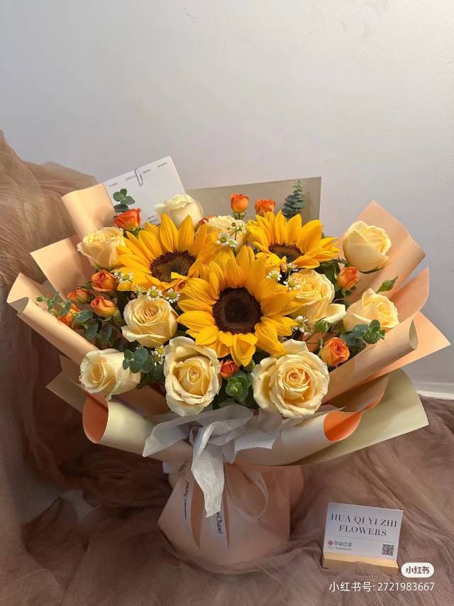 16朵香槟3向日葵橙色泡泡尤加利叶混搭花束 按图包装 |