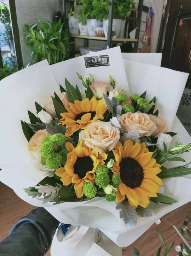 夜上海论坛5朵香槟玫瑰3支向日葵花束,英文报纸包装 |
