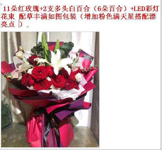 夜上海论坛11朵红玫瑰+2支多头白百合(6朵百合)+LED彩灯 花束 配草丰满如图包装(增加粉色满天星搭配漂亮点 ) |