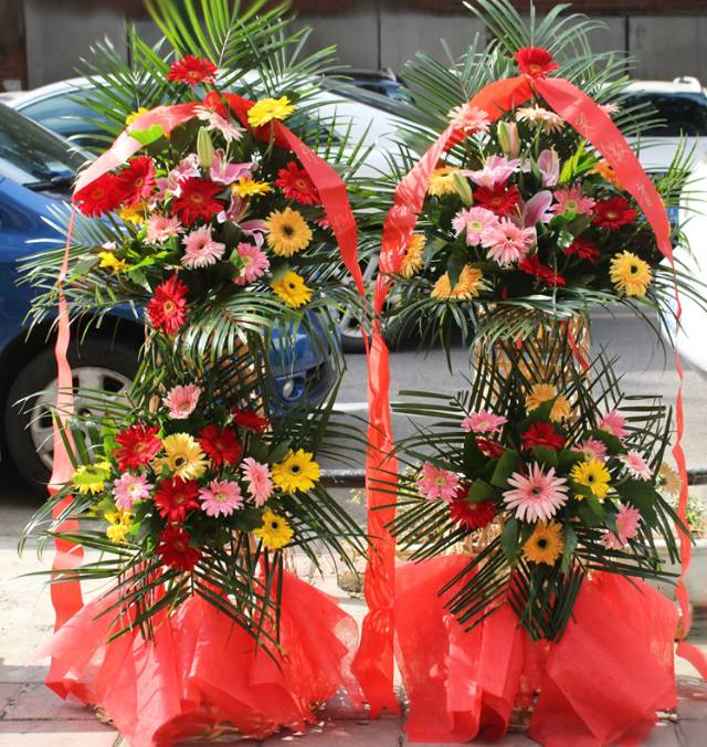 4个双层开业花篮,每个花篮花材:40朵扶郎花+4朵粉色百合花+栀子叶(或是绿色配草)+散尾叶+红色绵纸搭配丰满+花篮,按图制作,务必保证花材质量和新鲜度,如图效果 |