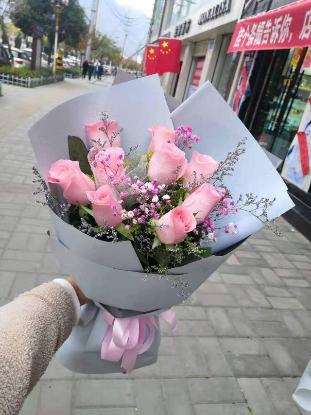 9朵粉玫瑰花束 款式包装搭配如图,花的颜色也要一致,谢谢 |