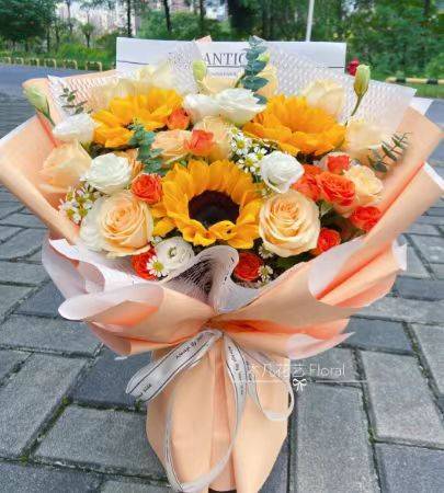 9朵香槟3向日葵桔梗橙色泡泡混搭花束 按图 |