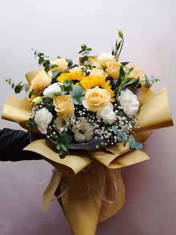 11朵香槟玫瑰2支向日葵桔梗满天星花束,如图制作 |