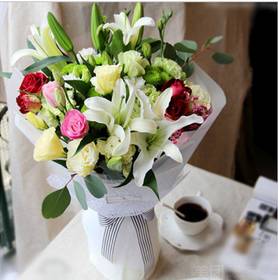 4朵红玫瑰+5朵康乃馨+8朵白百合配洋桔梗混搭花束,如图包装大气好看,有卡片,4月1号上午9点前送到。 |