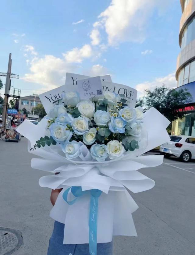 19支碎冰蓝玫瑰花束,按图包再配点满天星 |