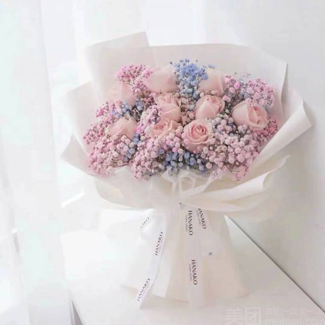 9朵粉玫瑰花束配双色满天星(白色包装纸)