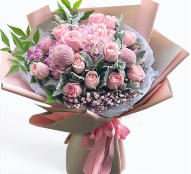 夜上海论坛15朵粉玫瑰2朵粉绣球2个乒乓球菊混搭花束 搭配小皱菊漫天星 款式包装按图做 |