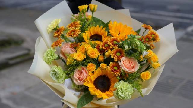 5支向日葵5支粉玫4支香槟玫瑰洋桔梗等 配花,花束如图包装大气好看,有卡片 ,按时送达。冲印相片2张。 |