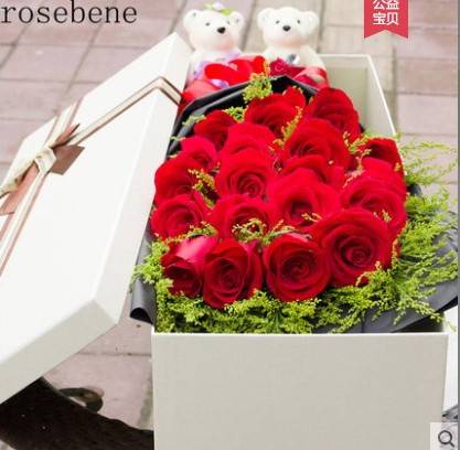 19朵红玫瑰鲜花礼盒+2个小熊 黄英搭配 外包装如图制作 白色长形礼盒 |