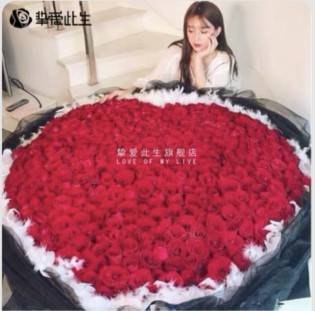 199朵红玫瑰心形花束,旁边用白色羽毛围一圈,黑纱包装,花束上面放小彩灯。包好看些。花一定要新鲜。用花泥插 |