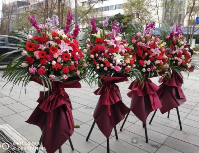 2个三角架花篮:花材:30朵红色太阳花+15朵康乃馨(红,粉混搭)+15朵粉玫瑰+8朵粉,白色百合混搭+5枝紫罗兰(紫色)+栀子叶+散尾叶,底下用暗红色纸包住(多包几层,有层次感) ,红色丝带,如图制作,花一定要饱满 ,一定要大气。 |