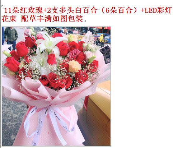 夜上海论坛11朵红玫瑰+2支多头白百合(6朵百合)+LED彩灯 花束 配草丰满如图包装(增加粉色满天星搭配漂亮点 ) |