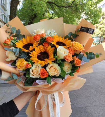 夜上海论坛8香槟3向日葵多头玫瑰混搭花束 如图包装 |
