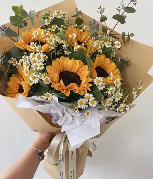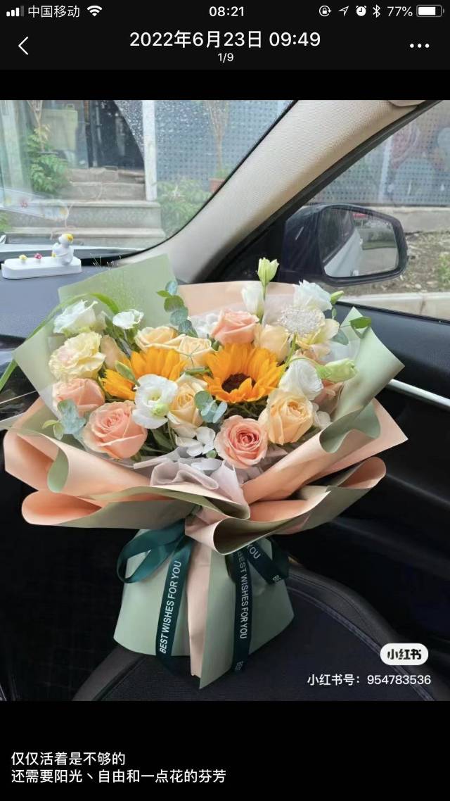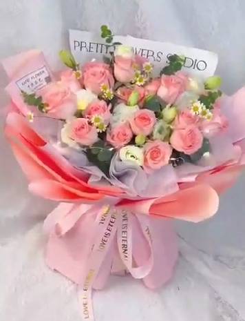 11朵粉玫加香槟混色加2朵向日花束。配花不要白色的。如图纸色包装 |