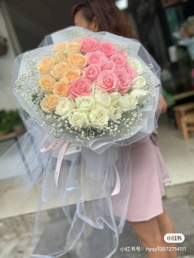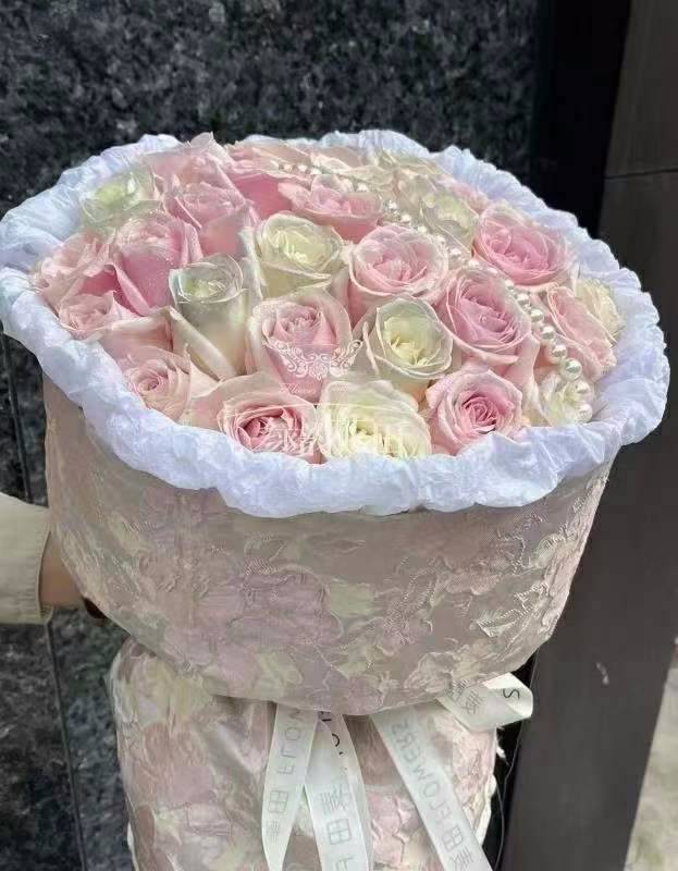 夜上海论坛33朵粉玫红玫香槟玫瑰白纱花束 按图包装 |