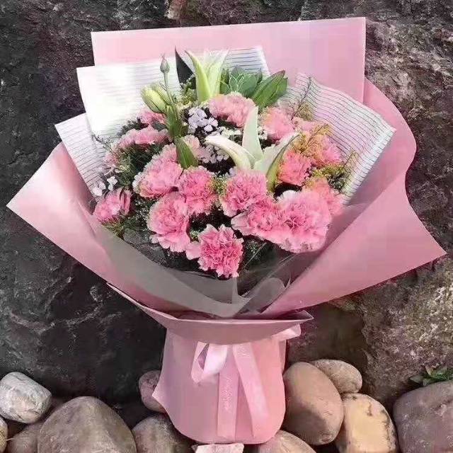 19支粉色康乃馨2支白色多头百合花束,如图制作 |