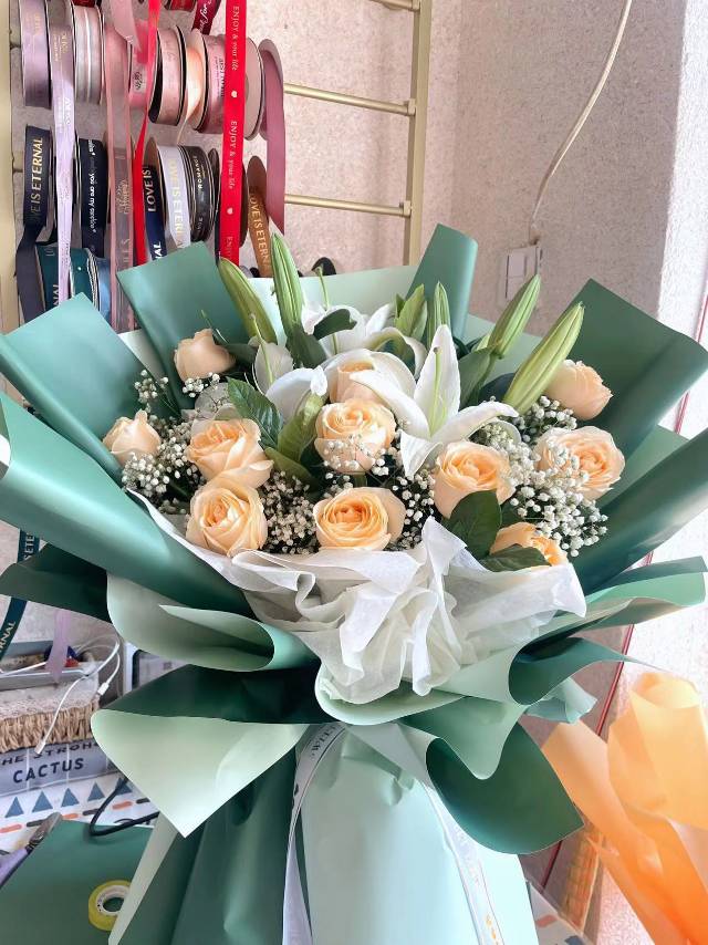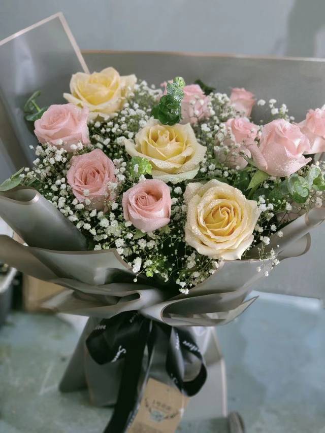 9朵香槟玫瑰,2朵白玫瑰,1朵粉玫瑰混搭花束,款式如图 |