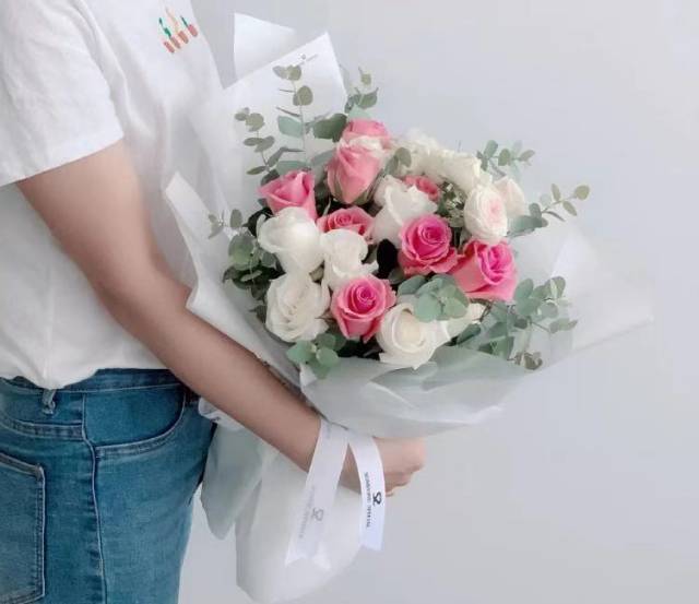 7朵白玫加2朵粉玫花束,如图款包,包装纸也用白的 |