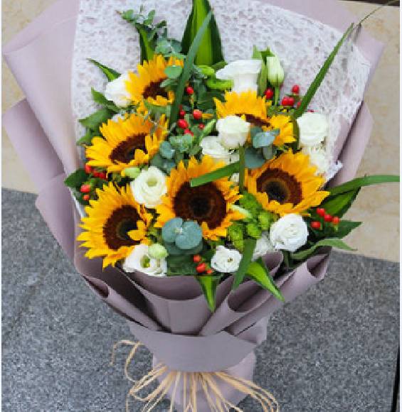 6朵向日葵9朵白色梗桔混搭花束 款式包装如图 |
