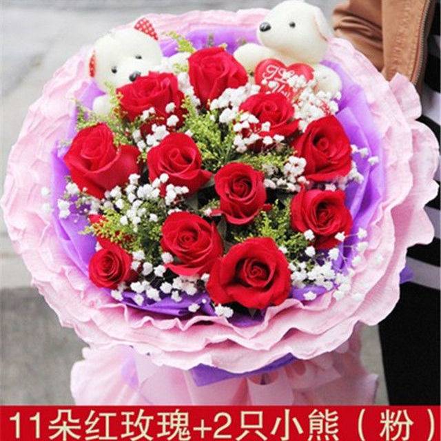 夜上海论坛主材:11朵红玫+2小熊,粉色包装,要大气!