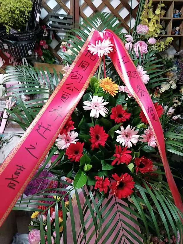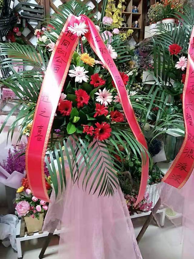 单层开业花篮一对(2个)如图,有贺词,9月15号上午10时务必按时送达。换粉色包装纸。 |