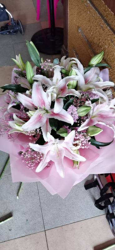夜上海论坛11朵粉玫瑰13朵粉百合 如图包装(不要白色绿色包装) |