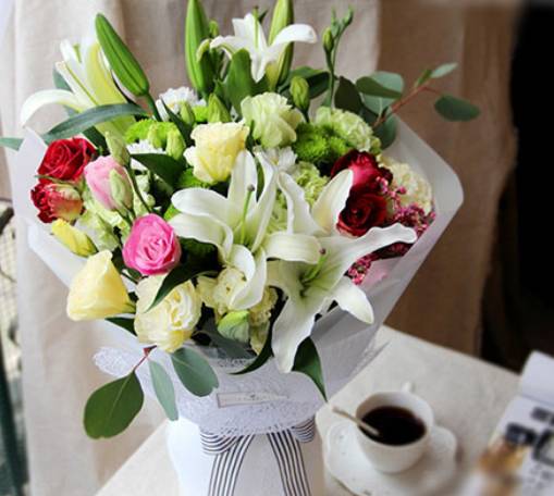 4支白色多头百合,4支红玫瑰、5支绿色康乃馨 5支桔梗、2支粉桔梗 雏菊、其他配花搭配,如图制作 |