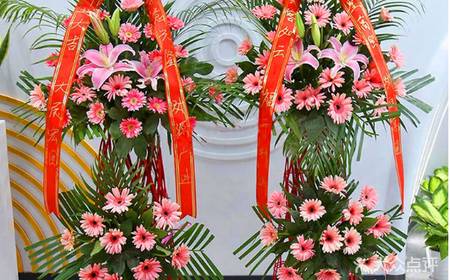 双层开业花篮一对(38朵粉色扶郎+4朵粉色百合每个)如图 |