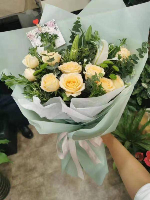 夜上海论坛11朵香槟玫加一支多头白百合花束,如图包 |
