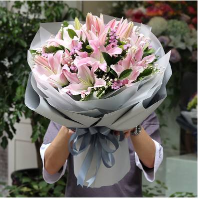 夜上海论坛16朵粉百合花束 款式包装如图 花材新鲜,百合要开的 |