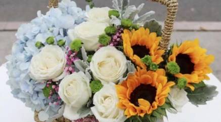 3朵向日葵9朵白玫瑰绣球花手提花篮 |