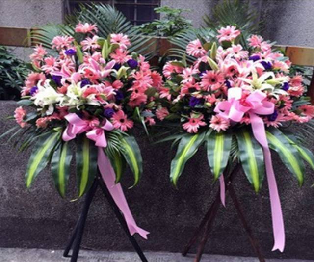 三脚架开业花篮2个(每个花篮40朵红玫瑰10朵百合)如图 |